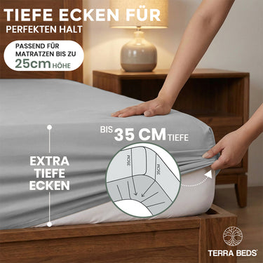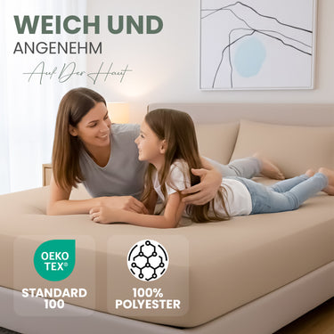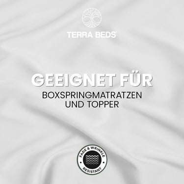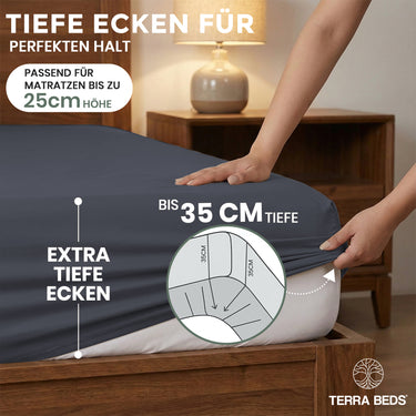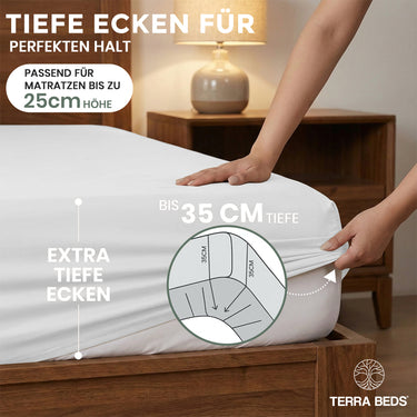 Our 90x200 cm cotton fitted sheets with a weight of 200 g/m² significantly surpass discount store quality (120–140 g/m²). The elasticated edges retain their shape even after 100 washes. For high mattresses, box spring beds up to 35 cm thick, or mattress toppers, we offer a depth of up to 40 cm.