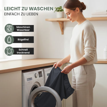 100% cotton (percale) is the best choice: breathable, moisture-regulating, skin-friendly, and washable at 60°C for allergy sufferers. Jersey cotton is more stretchy but less durable. Mako satin feels more luxurious but is more expensive and delicate. Our recommendation for everyday wear: 200 g/m² percale cotton .
