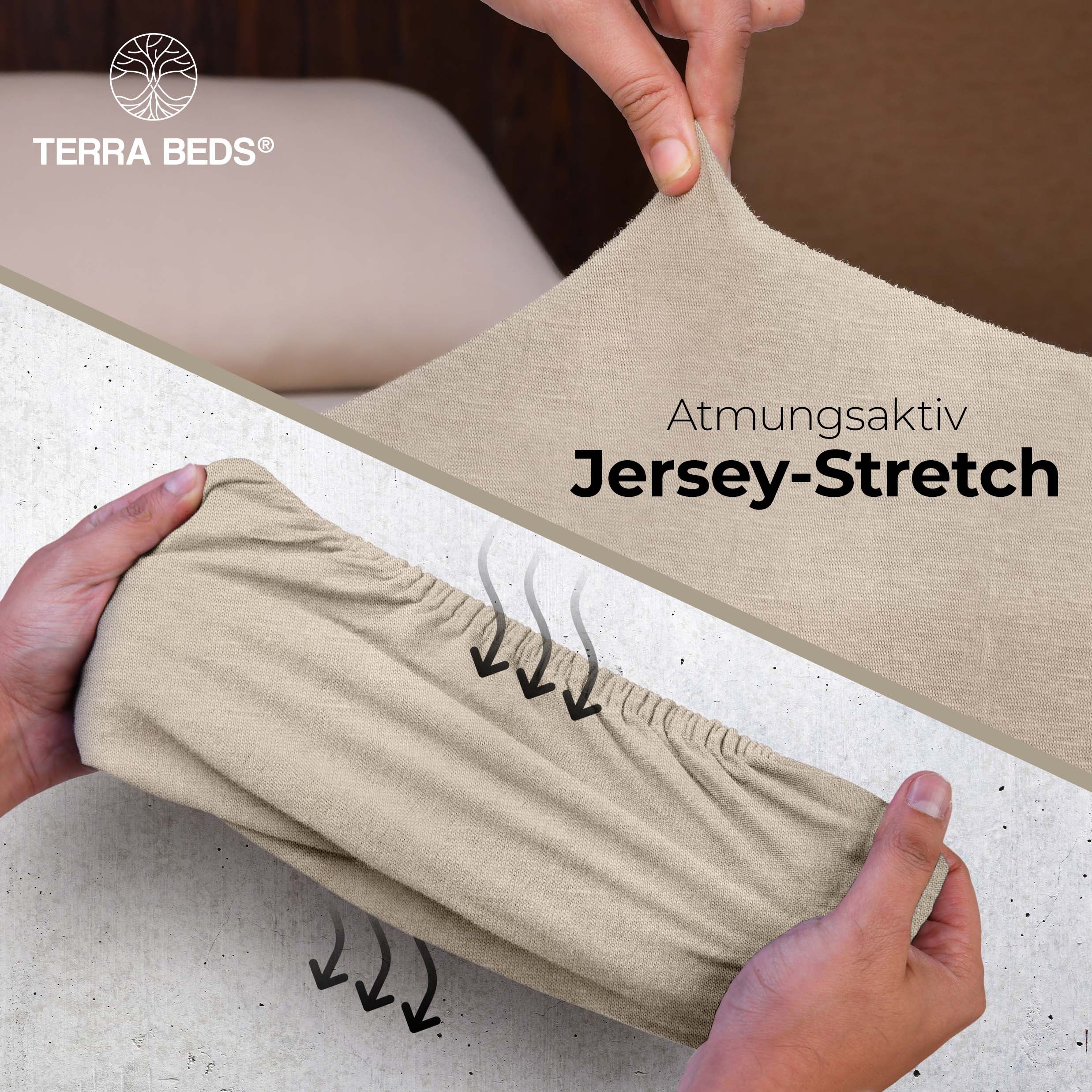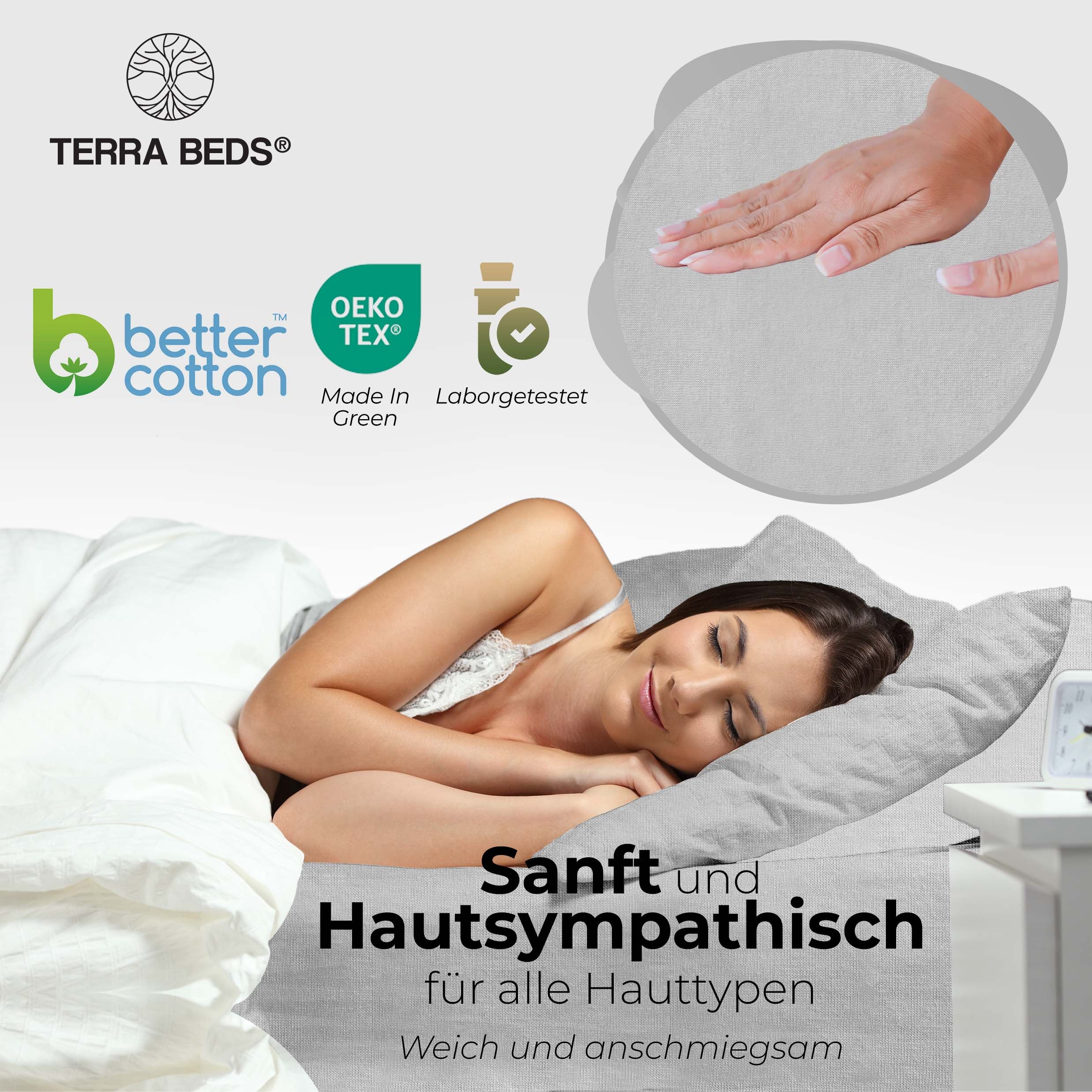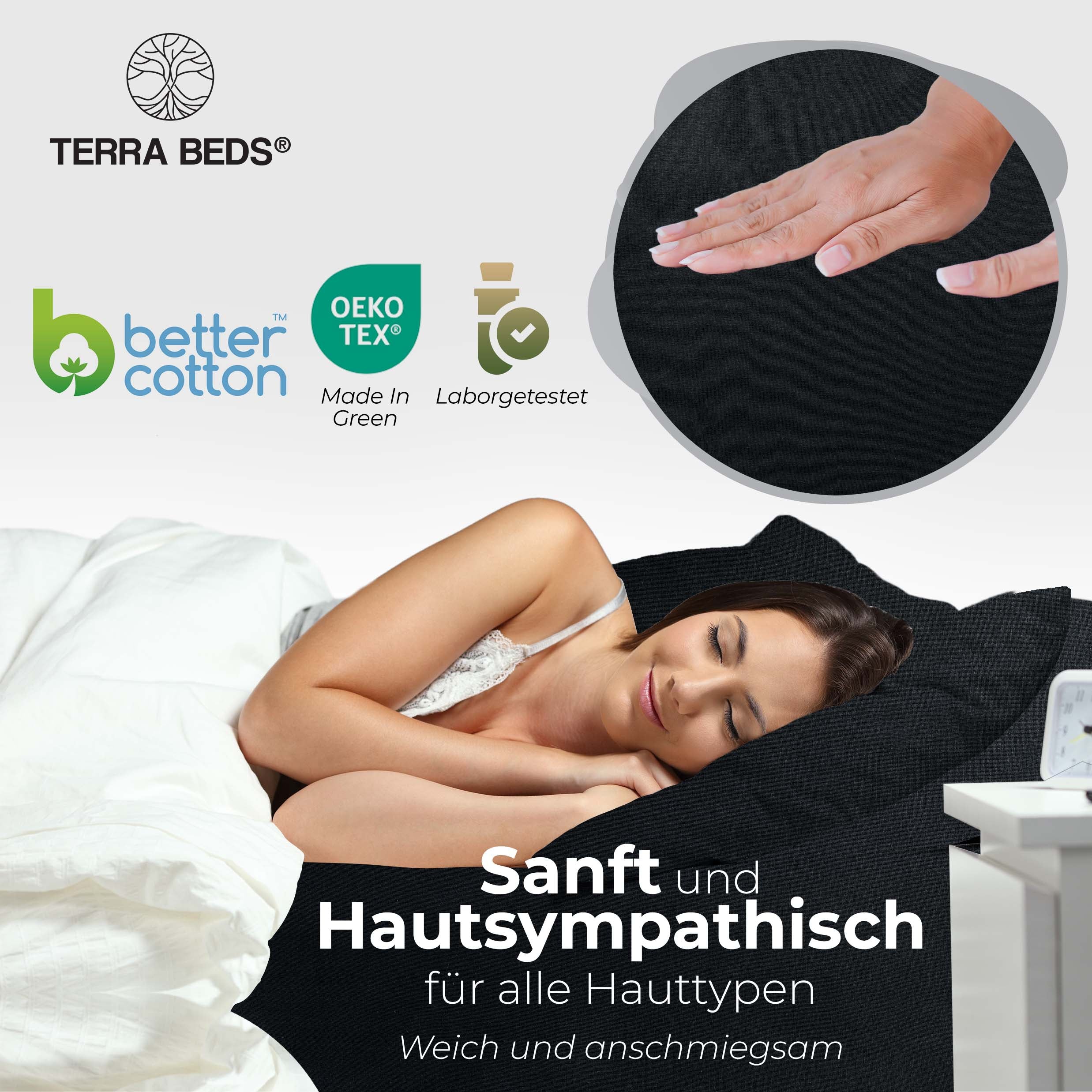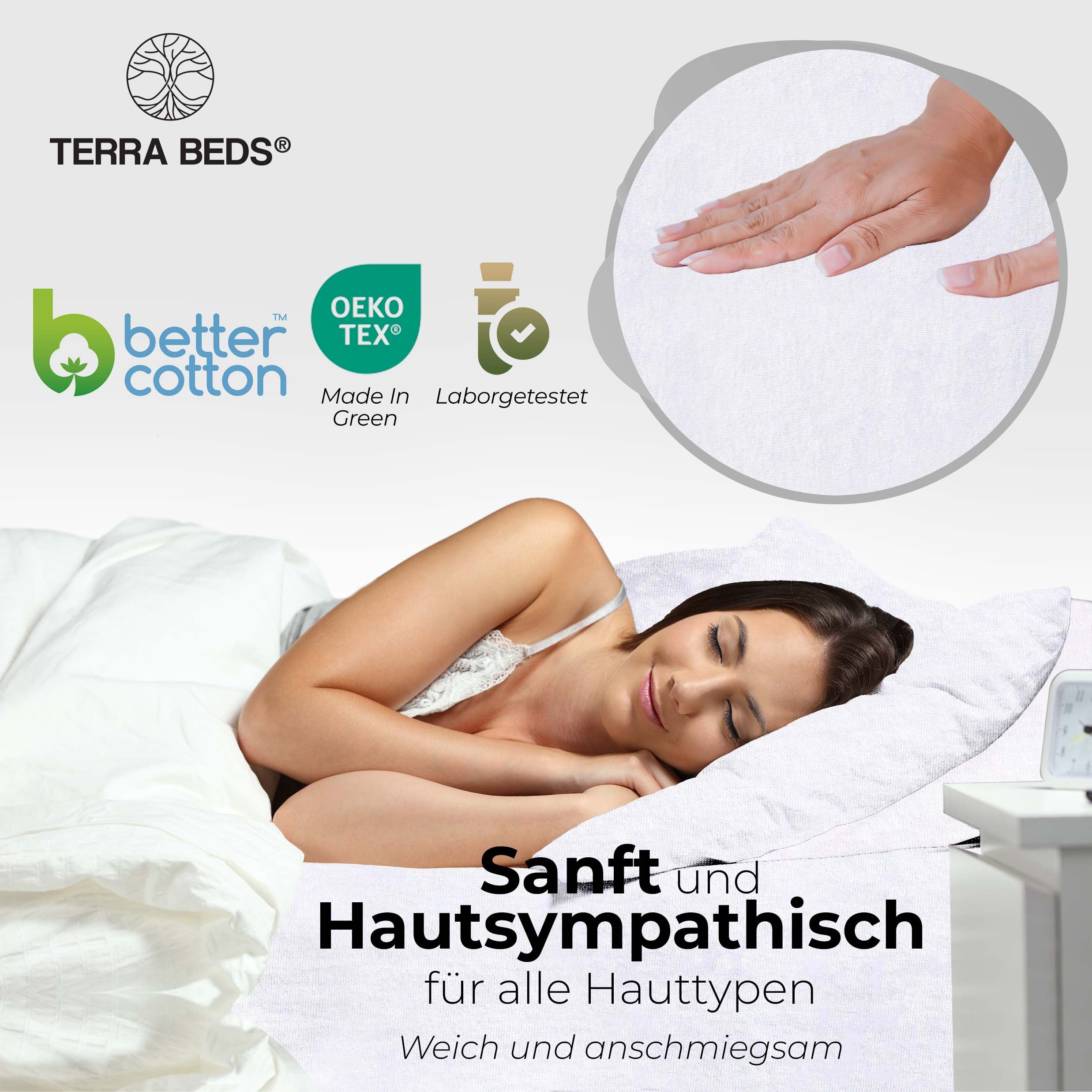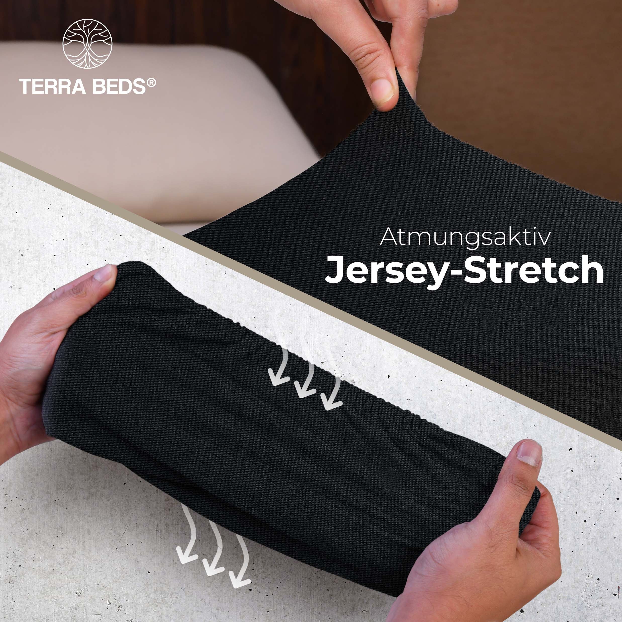 Discount-Jersey-Laken starten bei 80–100 g/m² — spar-orientiert, aber kurzlebig. IKEA und Basics-Modelle liegen bei ~140 g/m². Terra Beds' 160 g/m² Grammatur bedeutet: mehr Fülle, bessere Blickdichte, deutlich längere Lebensdauer. Der Stoff ist atmungsaktiv und feuchtigkeitsregulierend — pro Nacht verliert ein Mensch 0,2–1 Liter Schweiß; Baumwoll-Jersey nimmt diesen auf und gibt ihn kontrolliert ab. Das verbessert das Schlafklima messbar.