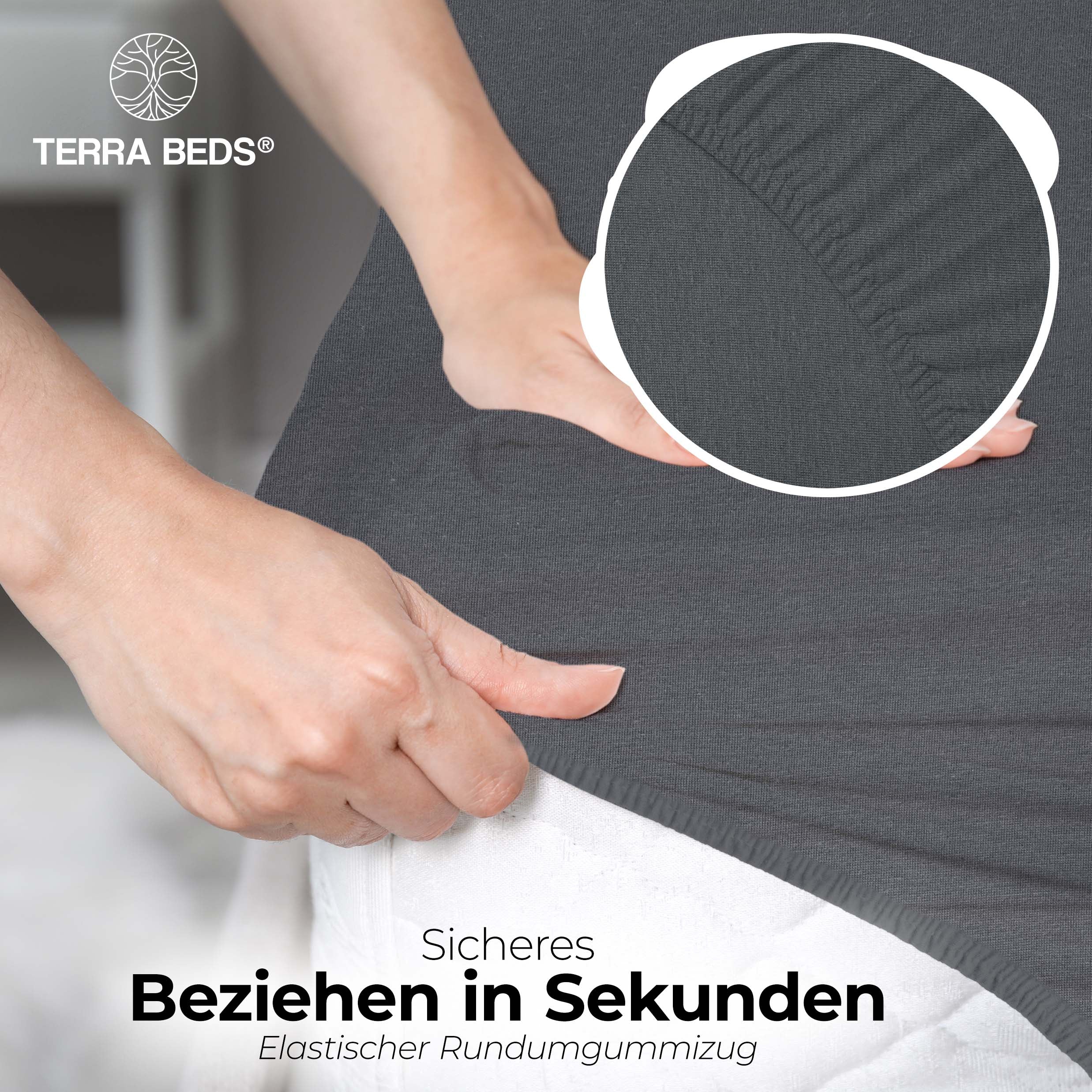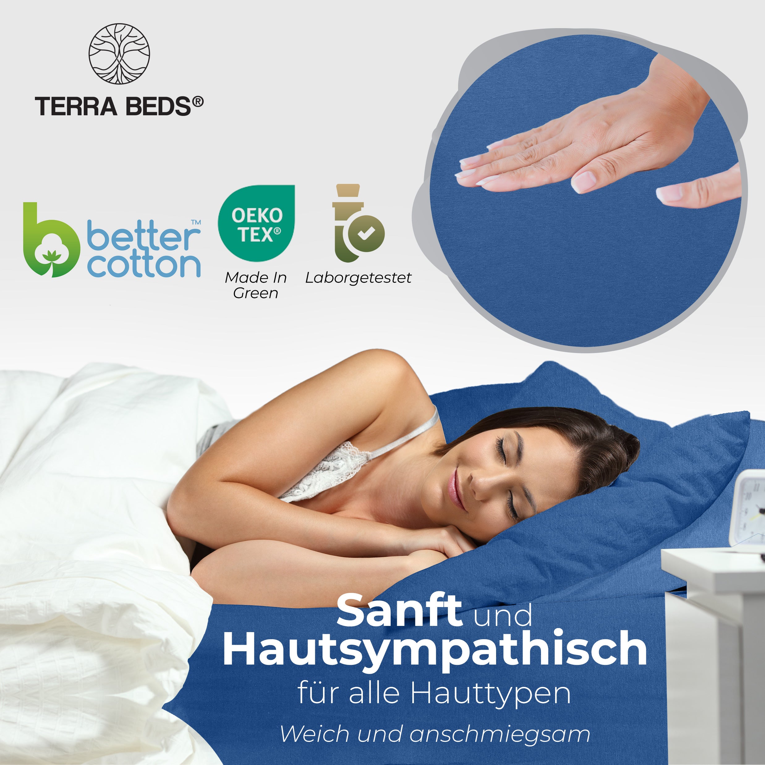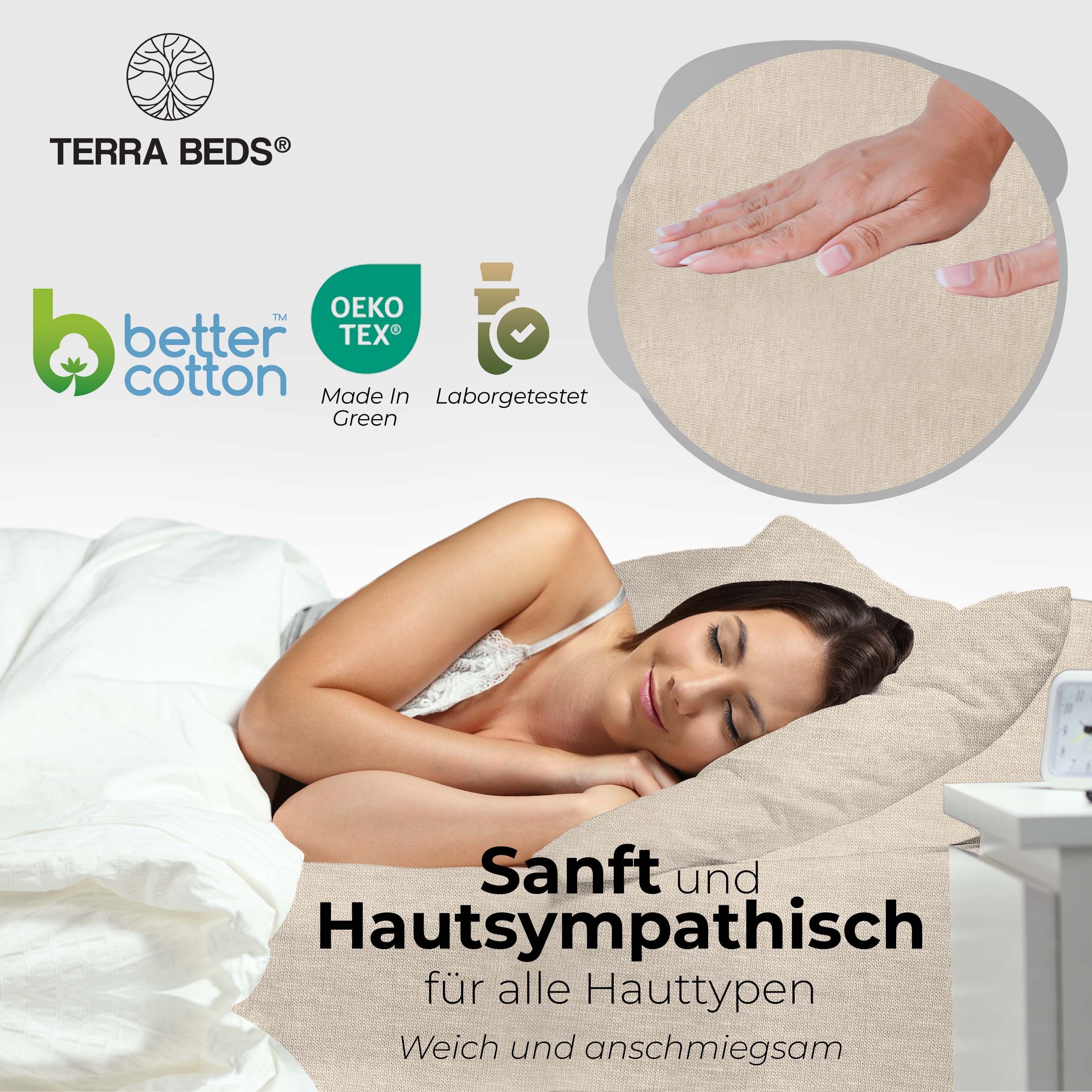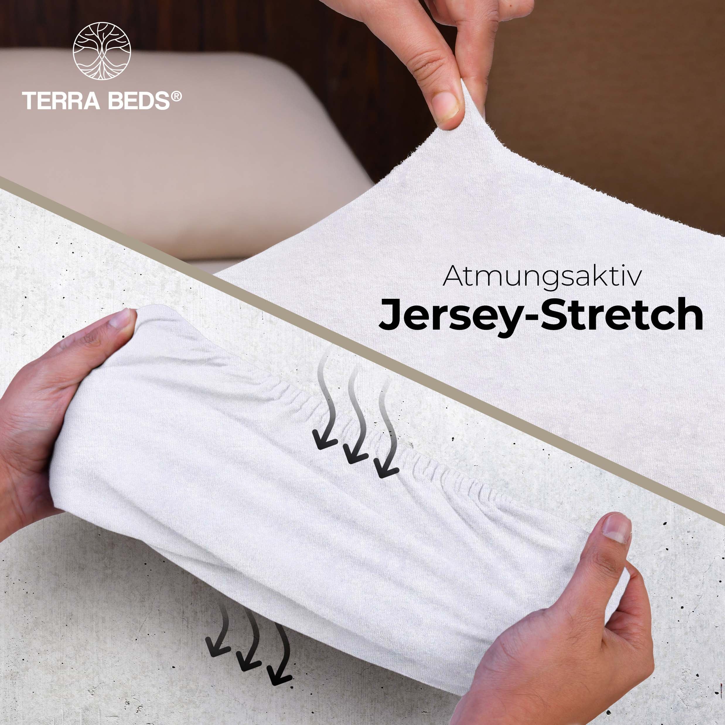 Discount-Jersey-Laken starten bei 80–100 g/m² — spar-orientiert, aber kurzlebig. IKEA und Basics-Modelle liegen bei ~140 g/m². Terra Beds' 160 g/m² Grammatur bedeutet: mehr Fülle, bessere Blickdichte, deutlich längere Lebensdauer. Der Stoff ist atmungsaktiv und feuchtigkeitsregulierend — pro Nacht verliert ein Mensch 0,2–1 Liter Schweiß; Baumwoll-Jersey nimmt diesen auf und gibt ihn kontrolliert ab. Das verbessert das Schlafklima messbar.