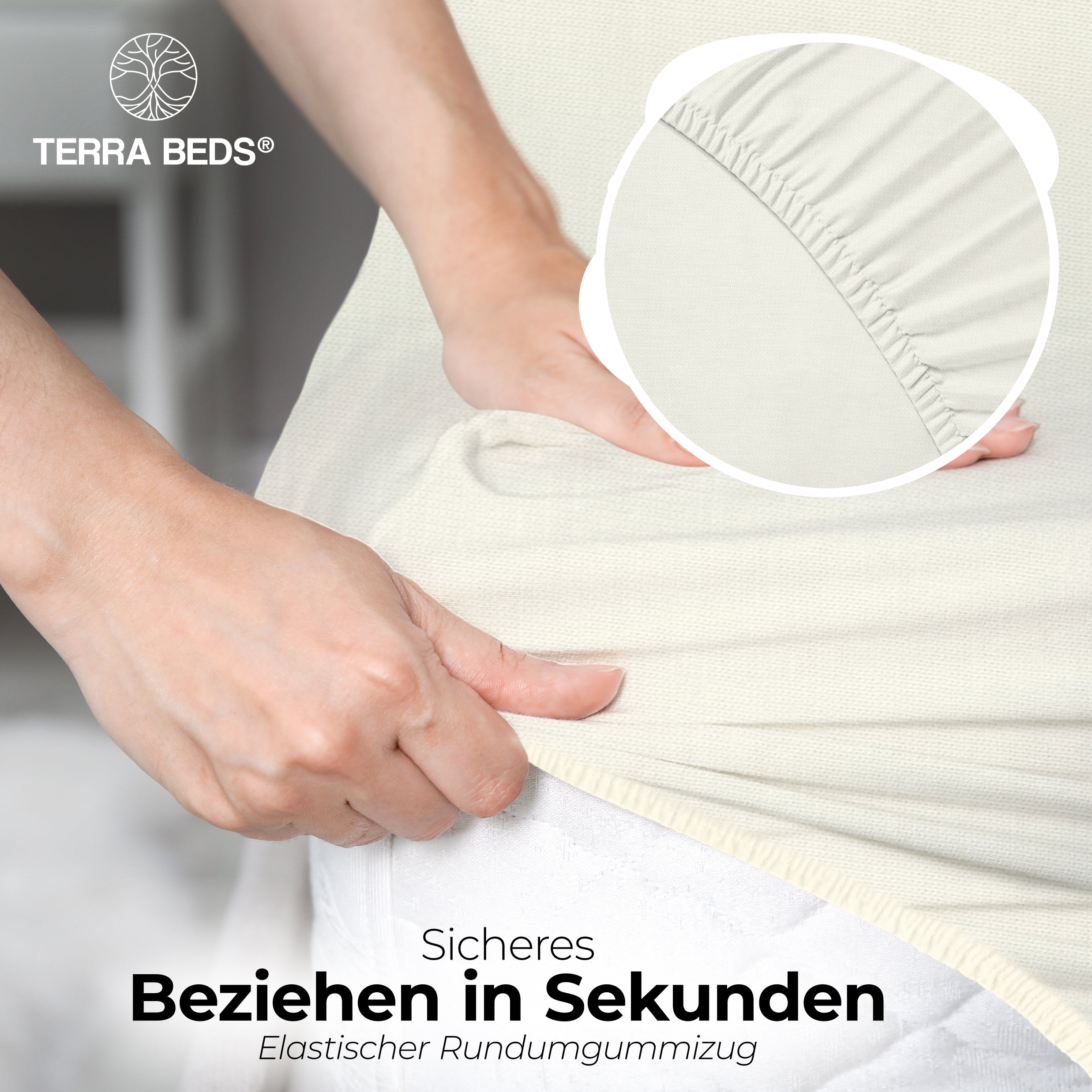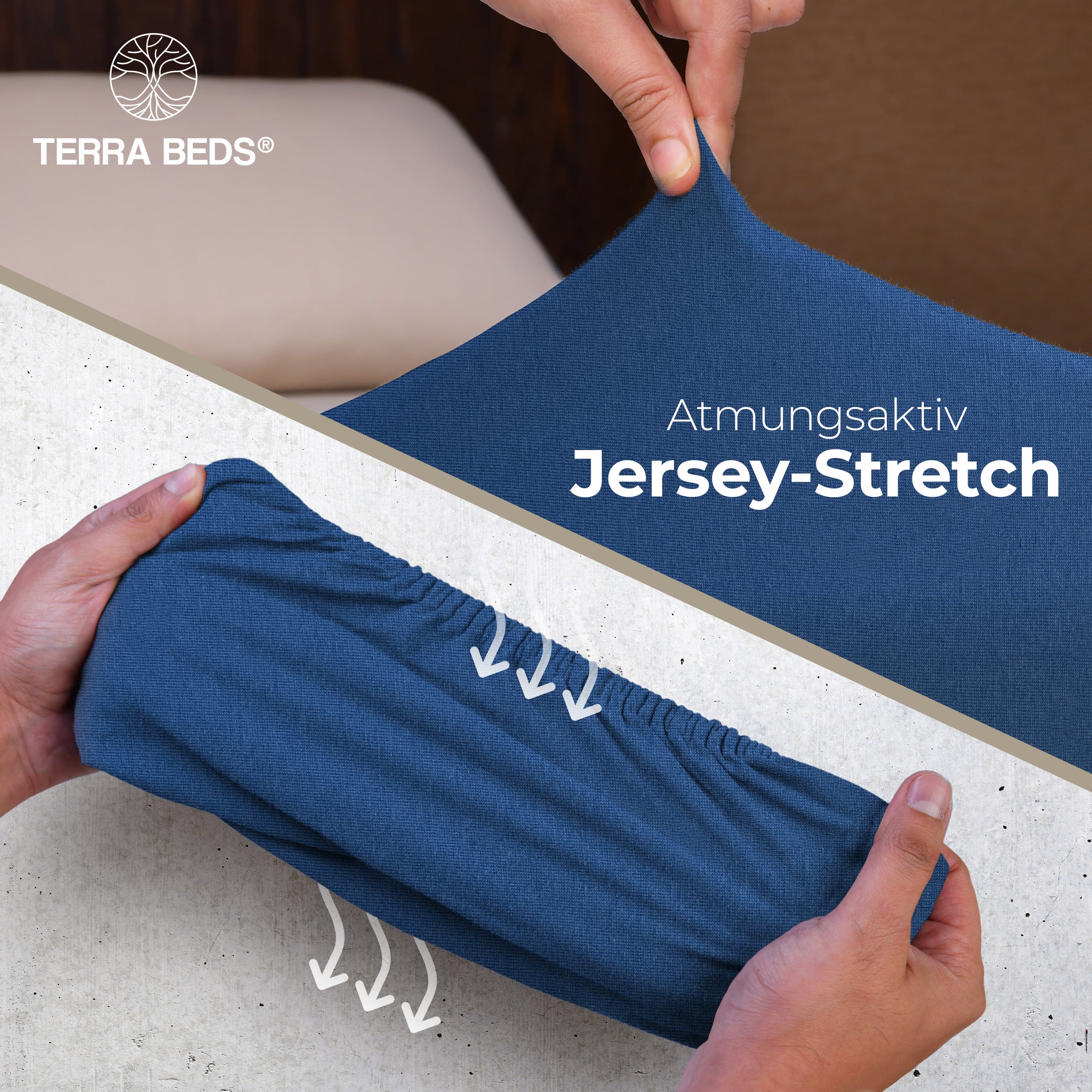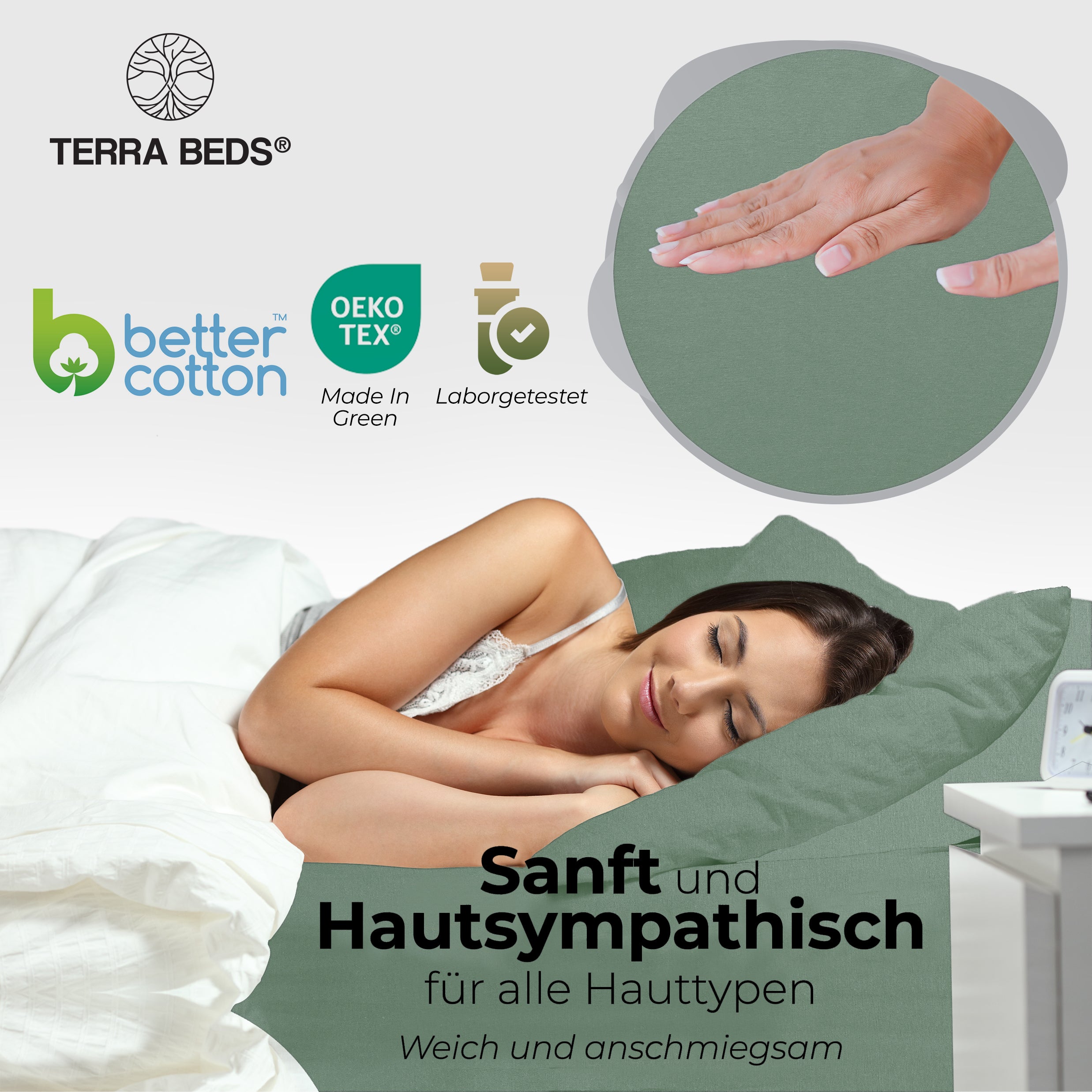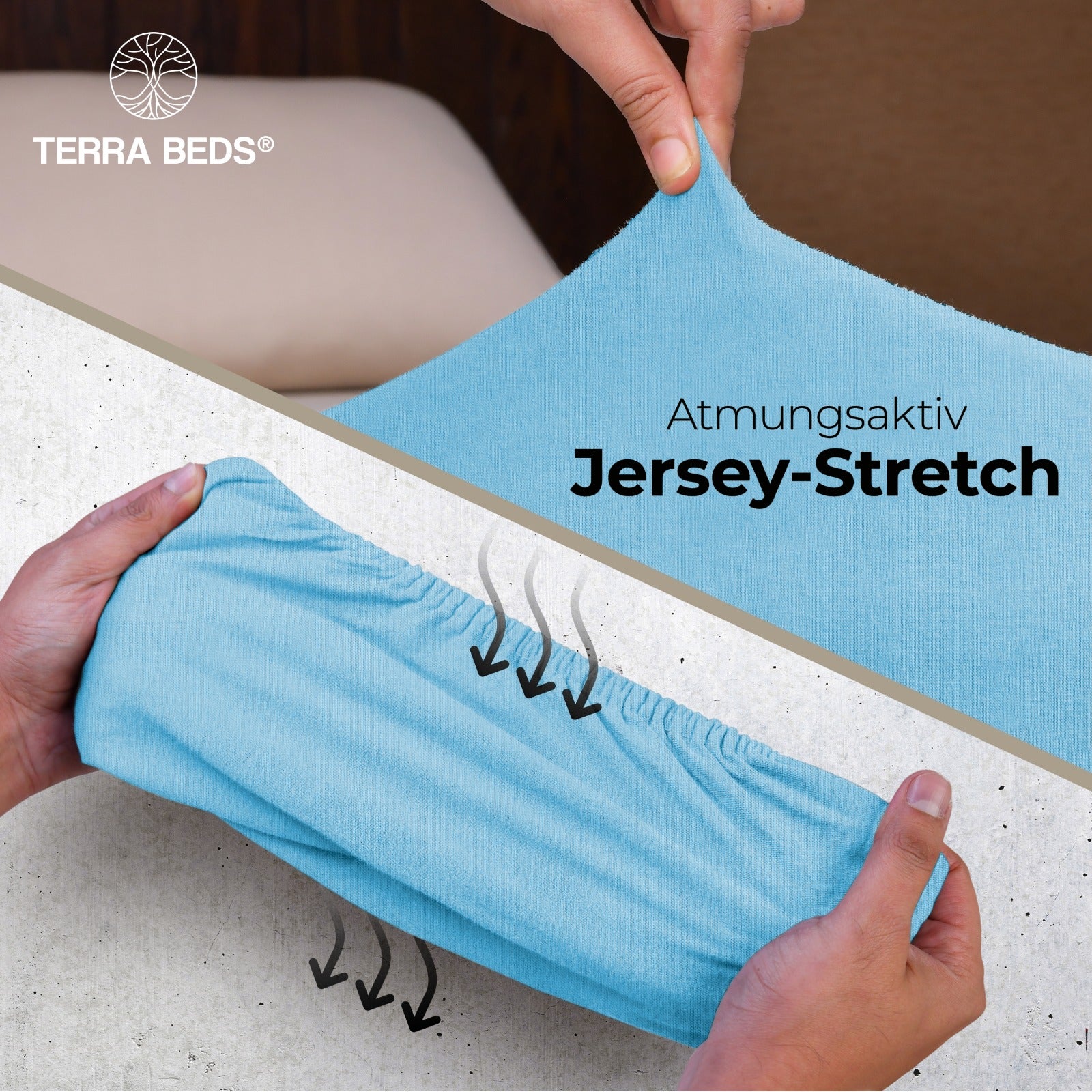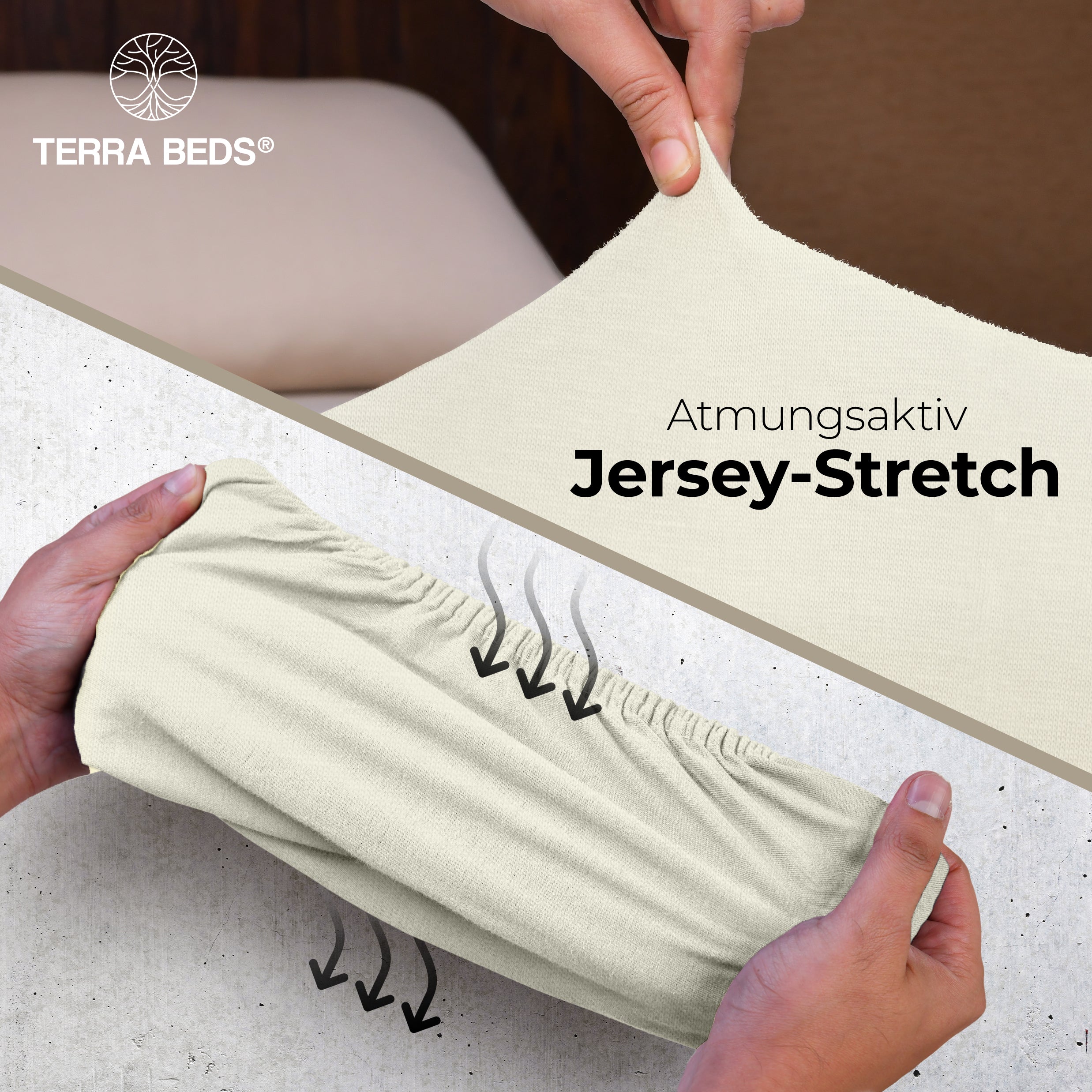 Discount-Jersey-Laken starten bei 80–100 g/m² — spar-orientiert, aber kurzlebig. IKEA und Basics-Modelle liegen bei ~140 g/m². Terra Beds' 160 g/m² Grammatur bedeutet: mehr Fülle, bessere Blickdichte, deutlich längere Lebensdauer. Der Stoff ist atmungsaktiv und feuchtigkeitsregulierend — pro Nacht verliert ein Mensch 0,2–1 Liter Schweiß; Baumwoll-Jersey nimmt diesen auf und gibt ihn kontrolliert ab. Das verbessert das Schlafklima messbar.
